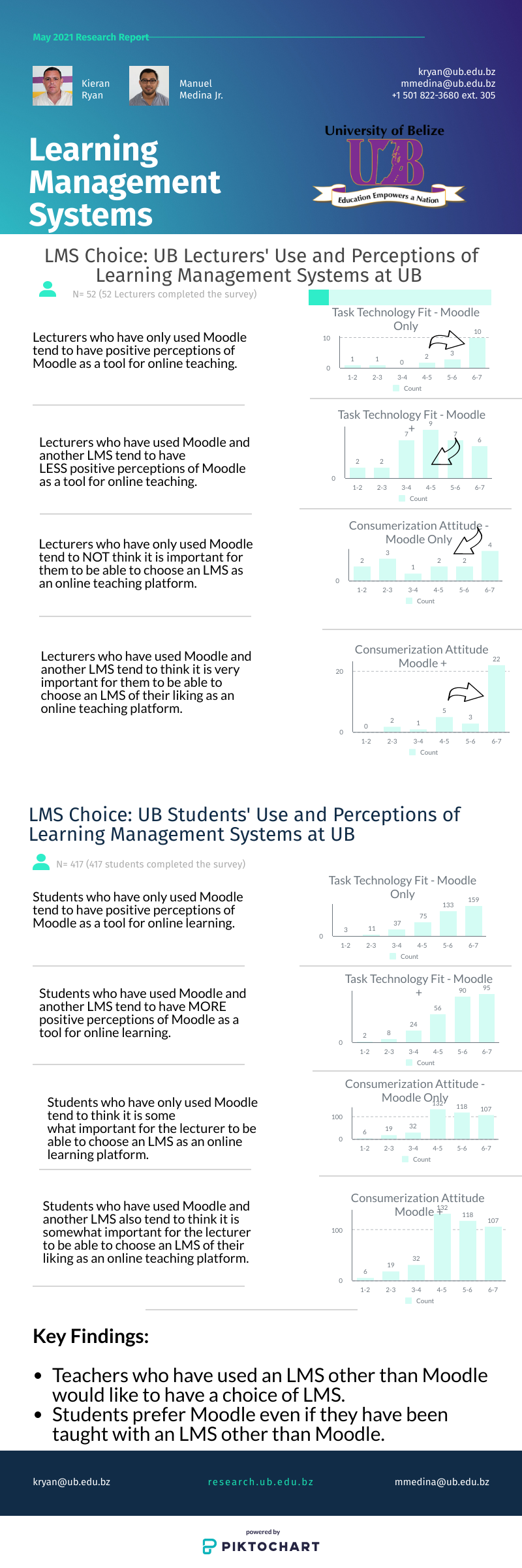The importance of Task Technology Fit (TTF) of Learning Management Systems (LMS) has been brought to the forefront due to the world wide move to online teaching and learning. The choice of which LMS to utilize is also of importance as lecturers could use systems managed by their institution such as Blackboard or Moodle or use commercial software available to individual lecturers. We developed a model combining the TTF construct with Consumerization Attituded, Expected Consequences of LMS Use, and Perceived Impact on Learning. Our findings showed that Lecturers at the University of Belize who have used their choice or LMS tend to prefer their choice over the institution's choice of LMS. However students tend to prefer the institutions choice of LMS over the LMS choice of lecturers who use non institutional LMS.Additional Files